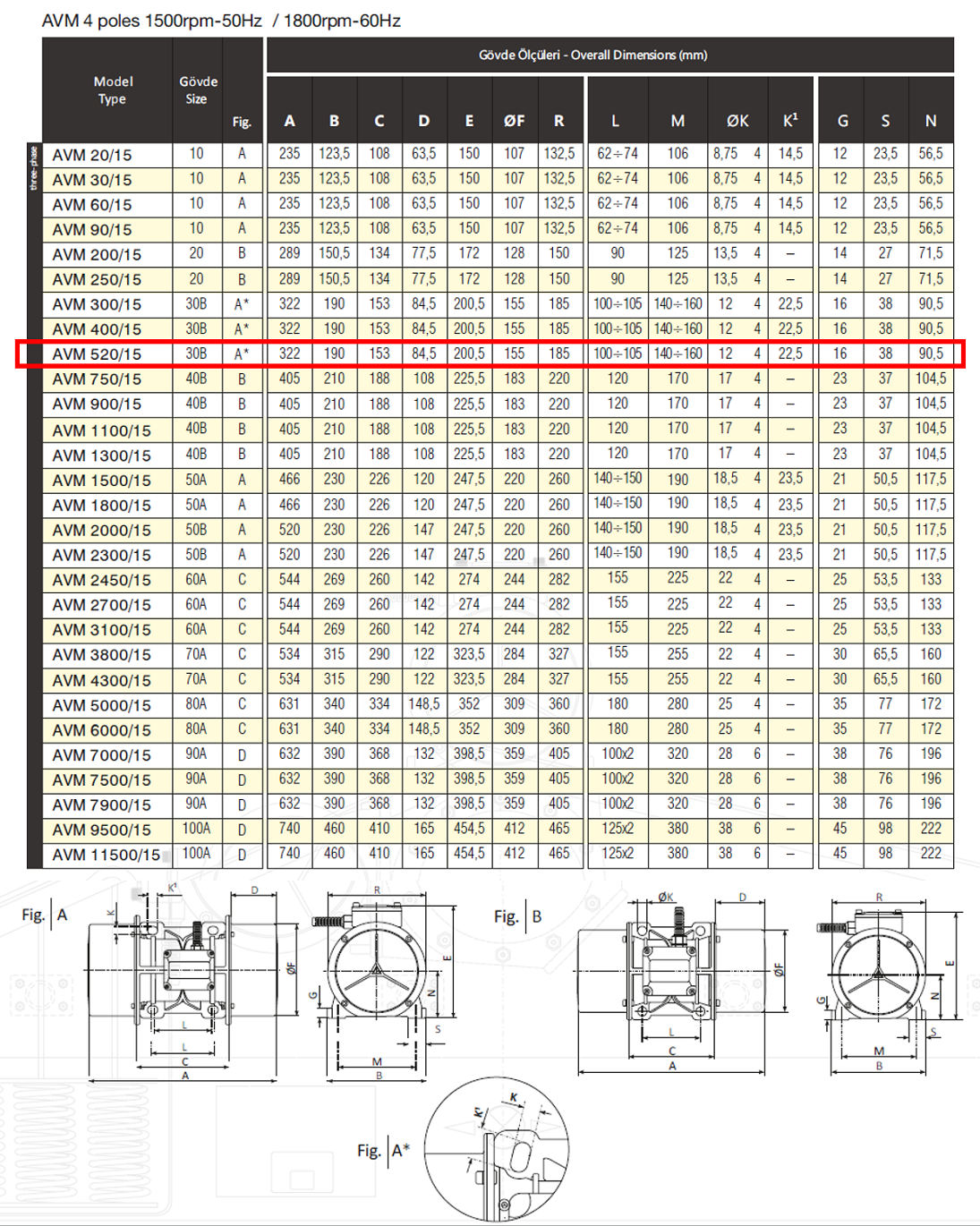 Avibro AVM 520/15 546 Kg/F 350 W 1500 D/D 400 volt Trifaze Vibrasyon Motoru Gövde Ölçüleri Tablosu ve Teknik Çizimi