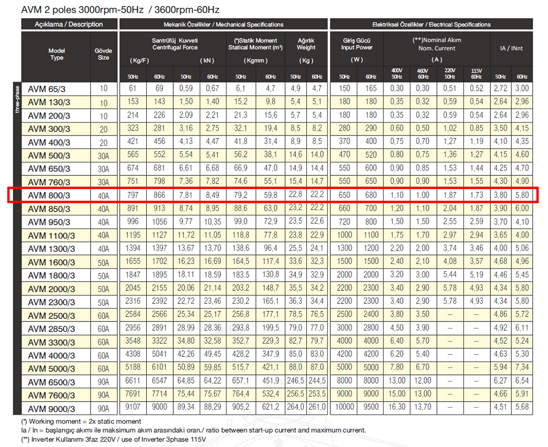 Avibro AVM 800/3 797 Kg/F 650 W 3000 D/D 400 volt Trifaze Vibrasyon Motoru Mekanik özellikler ve Elektriksel özellikler Tablosu