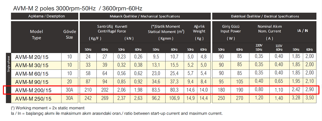 Avibro AVM-M 200/15 210 Kg/F 180 W 1500 D/D 220 volt Monofaze Vibrasyon Motoru Mekanik özellikler ve Elektriksel özellikler Tablosu