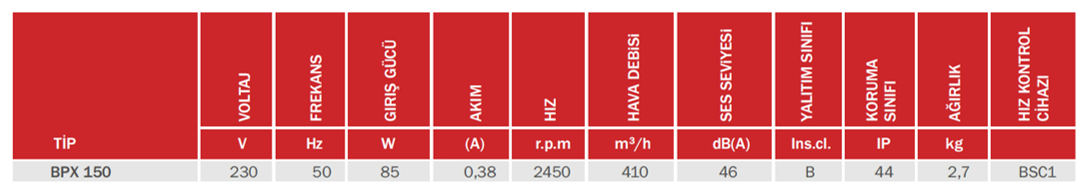 Bahçıvan BPX 150 2450 D/D Monofaze Plastik Kanal Fanı Geriye Eğimli Teknik Değerler Tablosu