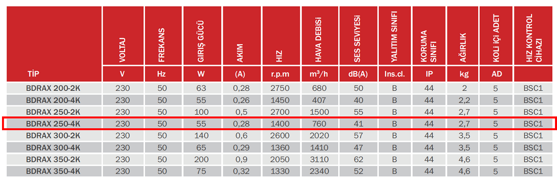 Bahçıvan BDRAX 250-4K 1400 D/D Monofaze Aksiyel Fan Teknik Değerler Tablosu