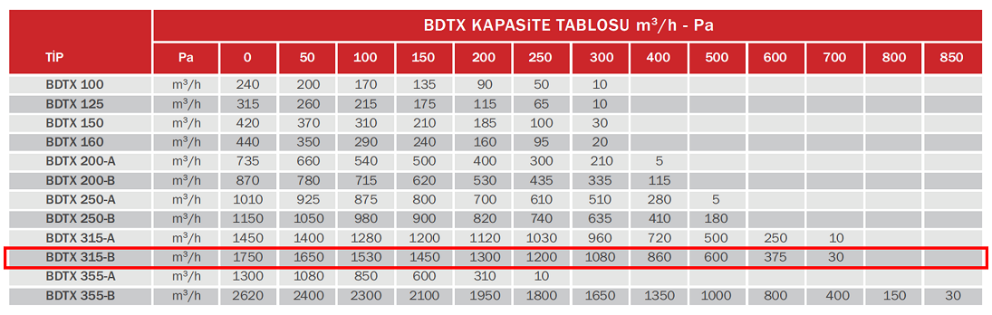 Bahçıvan BDTX 315-B 2500 D/D Monofaze Yuvarlak Kanal Fanı Geriye Eğimli Kapasite Tablosu