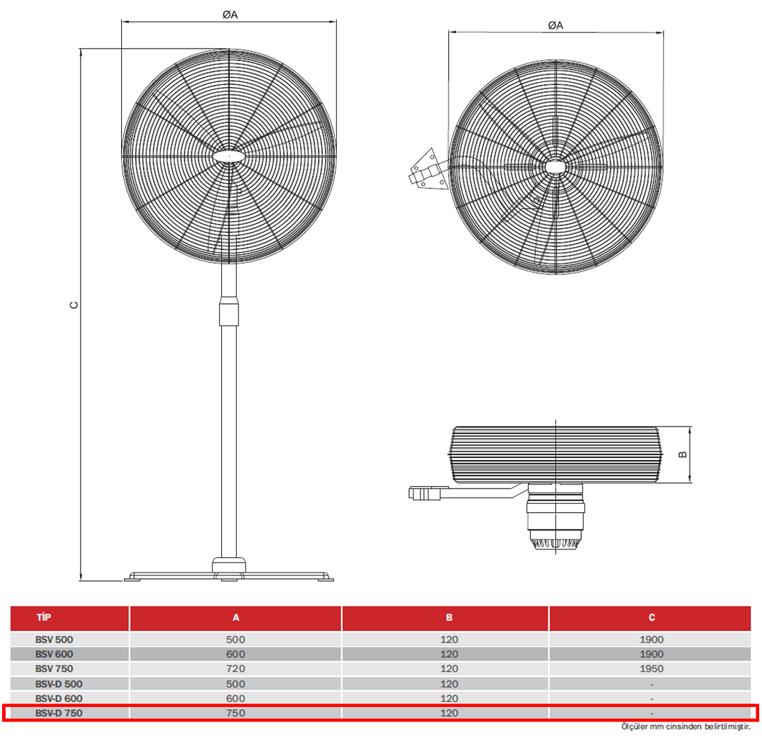 Bahçıvan BSV Serisi Sanayi Tipi Vantilatörler ayaklı ve duvar tipi olmak üzere 1400 D/D ve 230 volt Monofaze seçeneği ile üretilmektedirler. 220 volt Monofaze ile de çalıştırılabilmektedirler.