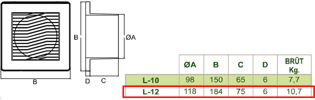 DÜNDAR L-12 model Plastik Fana ait detaylı bilgileri yukarıdaki ürün görsellerinin yanında bulabileceğiniz gibi teknik değerler tablosuna, teknik çizim ve ölçüler tablosuna ve cam-duvar-tavan montaj görseline de aşağıda ulaşabilirsiniz.