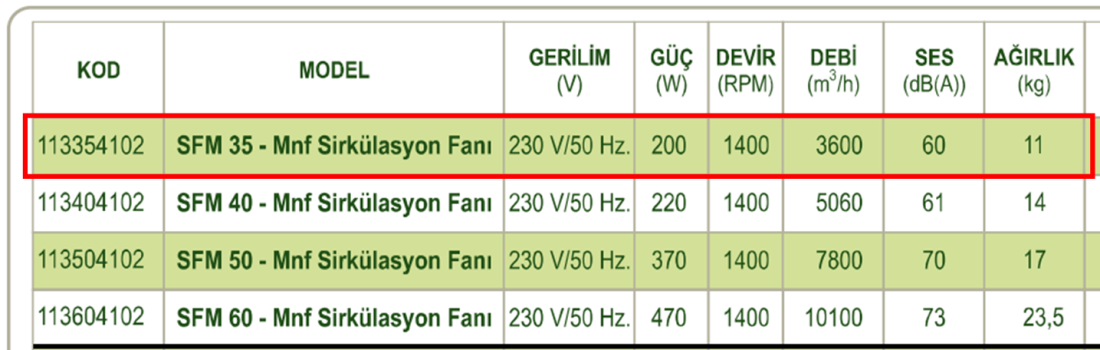 DÜNDAR SFM 35 1500 D/D Monofaze Aksiyal Tip Sirkülasyon Fanı Teknik Değerler Tablosu