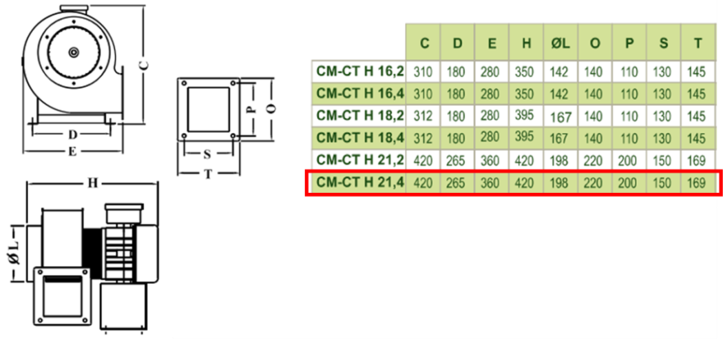 DÜNDAR CT 21.4H 1500 D/D Trifaze Radyal Sıcak Ortam Fanı Teknik Çizim ve Ölçüler Tablosu