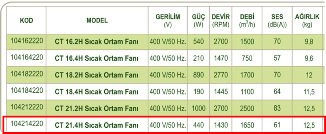 DÜNDAR CT 21.4H 1500 D/D Trifaze Radyal Sıcak Ortam Fanı Teknik Değerler Tablosu