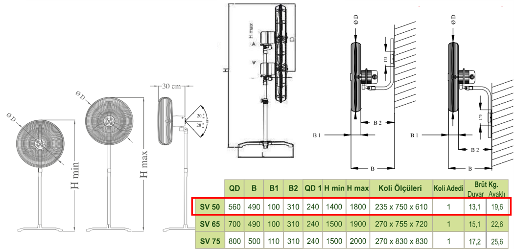 DÜNDAR SV Serisi Sanayi Tipi Vantilatörler ayaklı ve duvar tipi olmak üzere 1500 D/D ve 230 volt Monofaze seçeneği ile üretilmektedirler. 220 volt Monofaze ile de çalıştırılabilmektedirler.