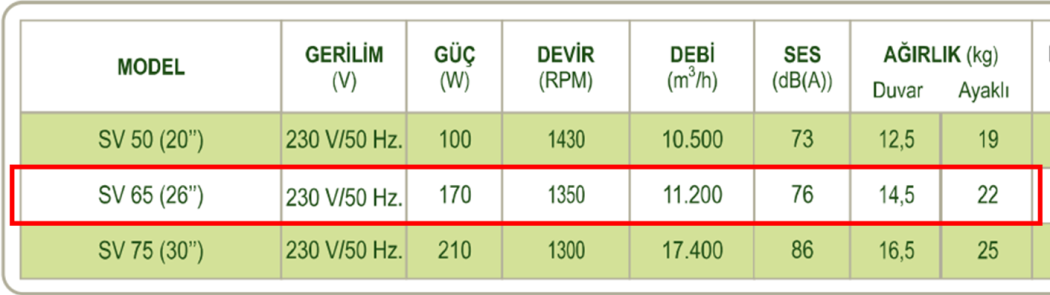 DÜNDAR SV 65 1500 D/D Monofaze Duvar Sanayi Tipi Vantilatör Teknik Değerler Tablosu