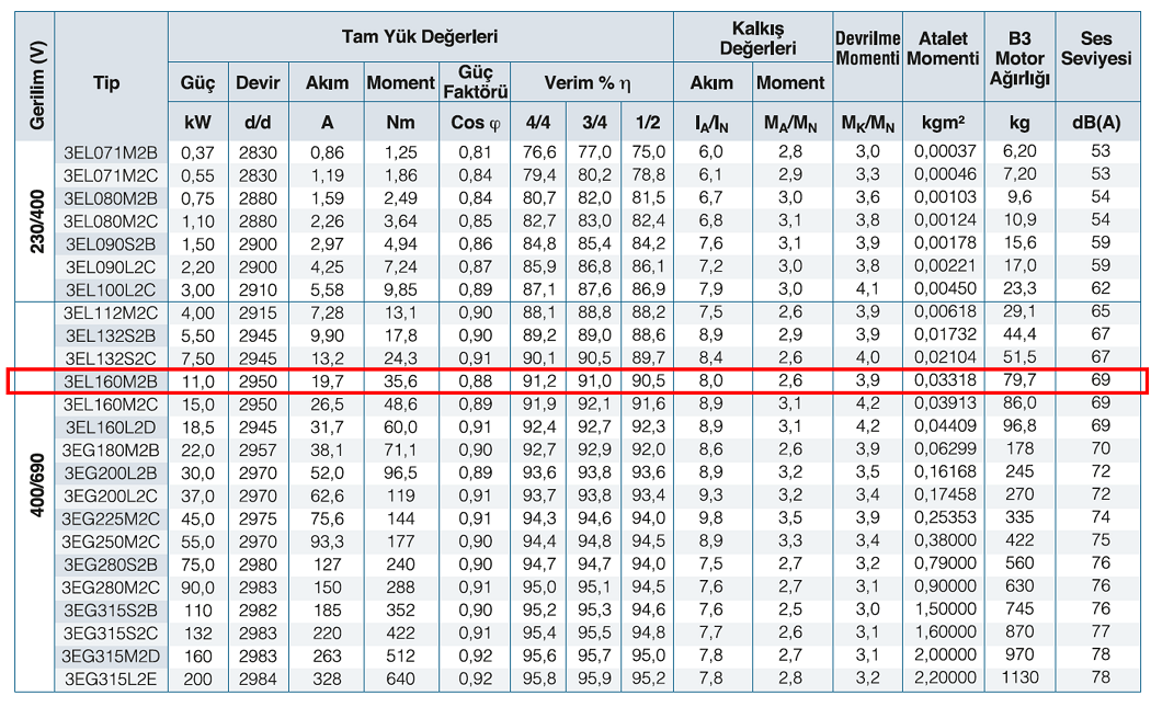 ELK 3EL160M2B 11 kw 3000 D/D Trifaze Elektrik Motoru Elektriksel Özellikler Tablosu
