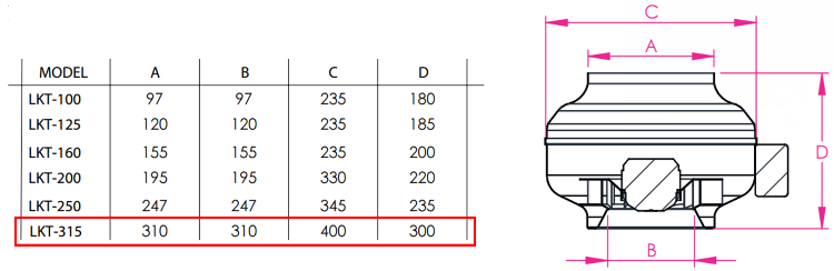 FANEX LKT 315-B 3000 D/D Monofaze Geriye Eğimli Yuvarlak Kanal Tipi Radyal Fan Teknik Çizimi ve Ölçüleri Tablosu