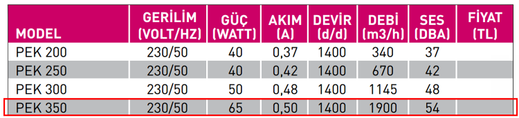 FANEX PEK 350 1500 D/D Monofaze Duvar Tipi Aksiyal Aspiratör Teknik Değerler Tablosu