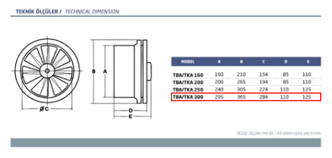 Fansan TBA-300 1300 D/D 230 V Monofaze Kapaksız Baca, Duvar Aspiratörü Teknik Çizimi ve Ölçüler Tablosu