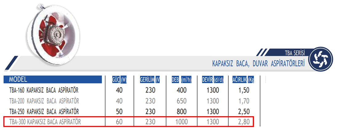Fansan TBA-300 1300 D/D 230 V Monofaze Kapaksız Baca, Duvar Aspiratörü Teknik Değerler Tablosu