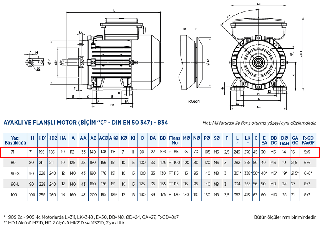 Gamak 0.18 kw 3000 D/D Monofaze Elektrik Motoru (MS21D 71 M 2a) B34 Ayaklı Flanşlı Yapı Biçimi Boyut Tablosu