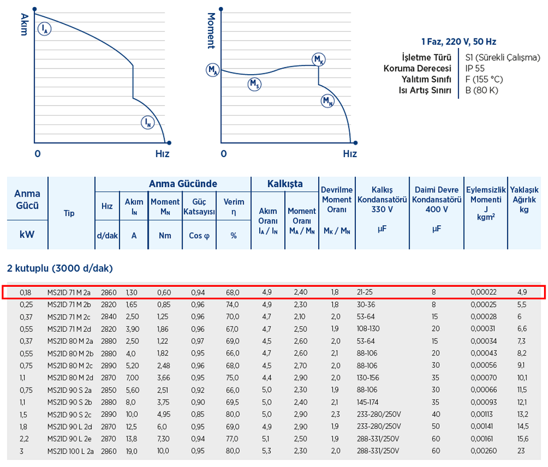 Gamak 0.18 kw 3000 D/D Monofaze Elektrik Motoru (MS21D 71 M 2a) İşletme Değerleri Tablosu