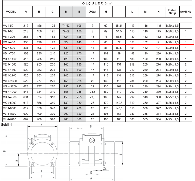 Miksan VC 4-400 0.32 kw 1500 D/D 400 volt Trifaze Vibrasyon Motoru Teknik Çizimi ve Ölçüleri Tablosu