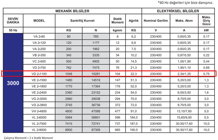 Miksan VD 2-1100 0.75 kw 3000 D/D 400 volt Trifaze Vibrasyon Motoru Mekanik ve Elektriksel Bilgiler Tablosu