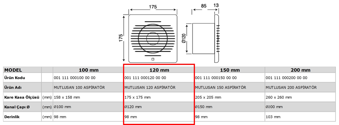 Mutlusan Mutlusan 120 tip Ev/Ofis, Mutfak, Banyo/WC Kare Duvar Aspiratörüne ait detaylı bilgileri yukarıdaki ürün görsellerinin yanında bulabileceğiniz gibi teknik değerler tablosuna ve teknik çizim ve ölçüler tablosuna da aşağıda ulaşabilirsiniz.