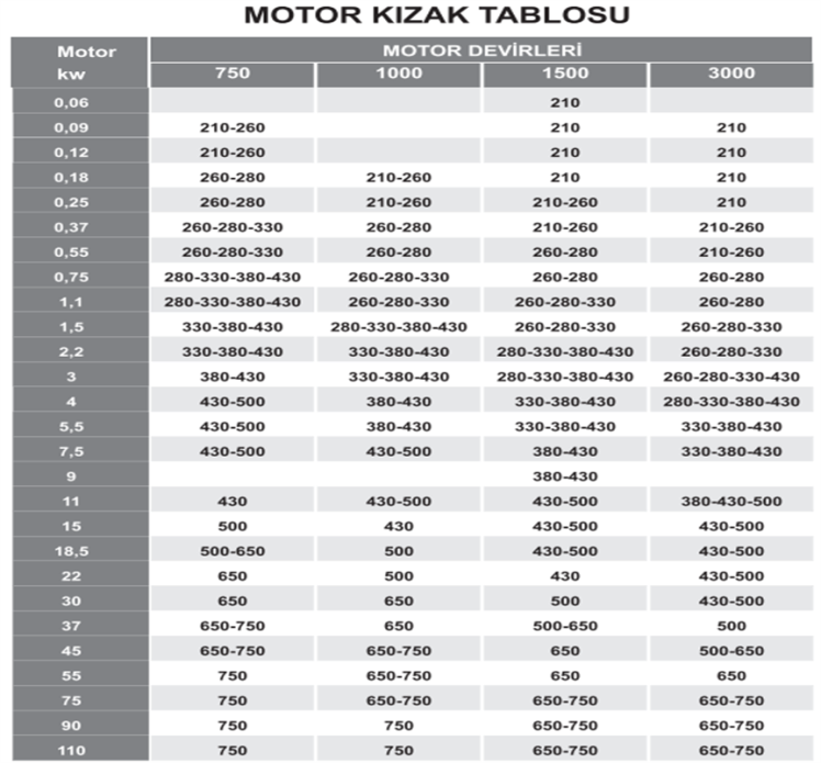 Orka MKK 210 tip İnce Saclı Motor Kızağı aşağıdaki tabloda belirtilen farklı kw ve devirlerdeki elektrik motorları ile uyumlu olarak kullanılabilmektedir.