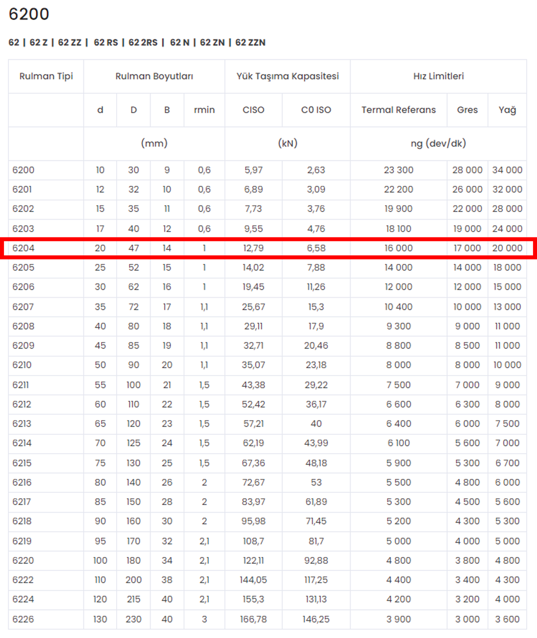 ORS 6204 ZZ Rulmanına ait detaylı bilgileri yukarıdaki ürün görsellerinin yanında bulabileceğiniz gibi teknik değerler tablosuna da aşağıda ulaşabilirsiniz.