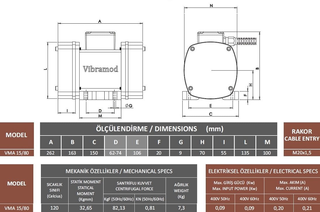 Vibramod VMA 15/80 82.13 Kg/F 0.1 kw 1500 D/D 400 volt Trifaze Vibrasyon Motoru Mekanik ve Elektriksel Özellikler Tablosu, Gövde Ölçülendirme Tablosu ve Teknik Çizimi