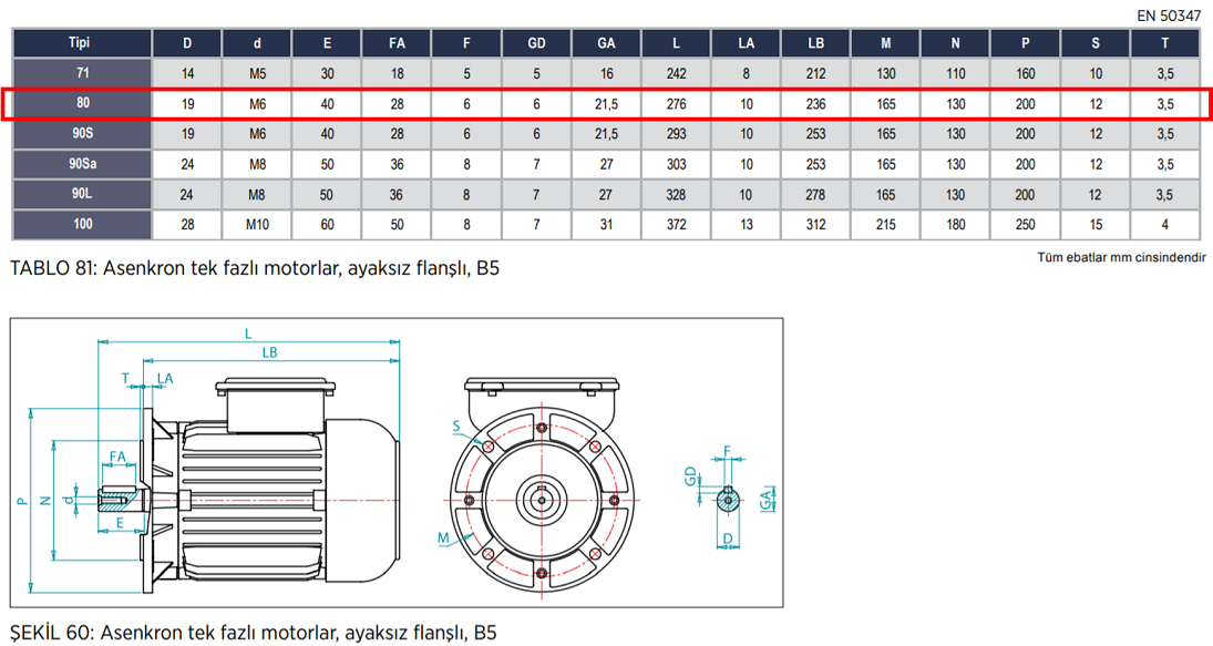 VOLT 0.55 kw 3000 D/D Monofaze Elektrik Motoru (VSSA 80 M2D) B5 Ayaksız Flanşlı Mekanik Değerler (Yapı Biçimi Boyut) Tablosu